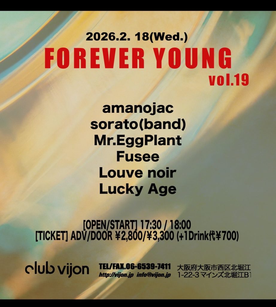 “FOREVER YOUNG vol.19” 2026.01.10 2026.2.18(水) @北堀江club vijon 【TIME】 OPEN/START 17:30/18:00 【TICKET】 ADV / DOOR ¥2,800 / ¥3.300 【ACT】 amanojac sorato(band set) Mr.EggPlant Fusee Louve noir Lucky Age チケット取り置き受付中