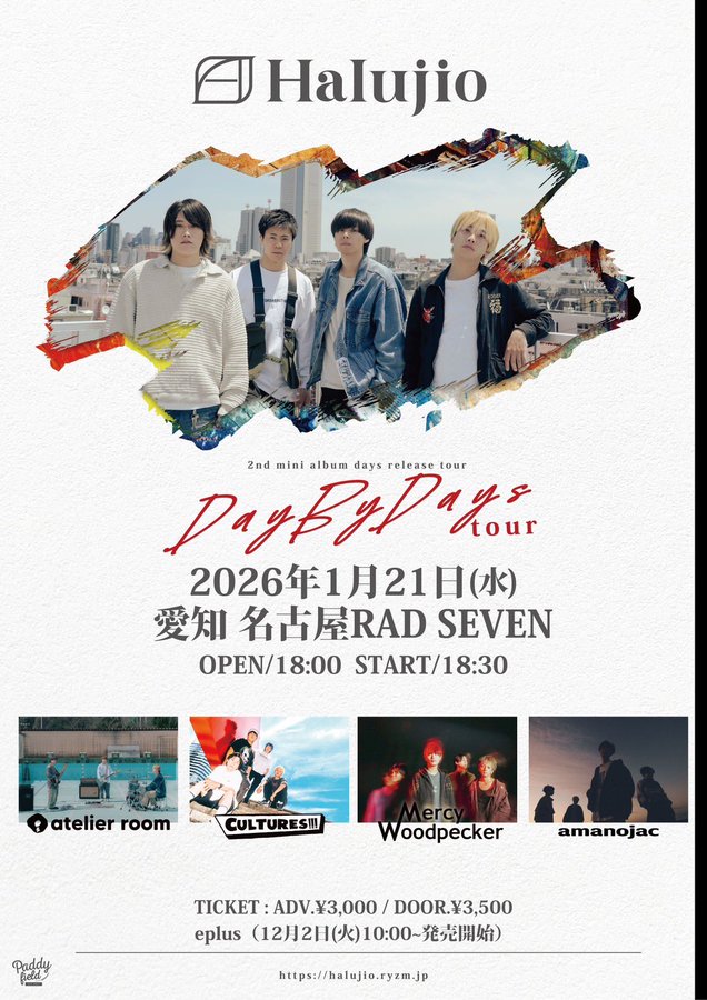 2026/1/21(水)にRAD SEVEN(名古屋)で行われるHalujio 2nd mini album「days」release tour “DayByDays tour”のチケット情報ページです。会場情報、開演時間や料金を確認し、Halujio 2nd mini album「days」release tour ...